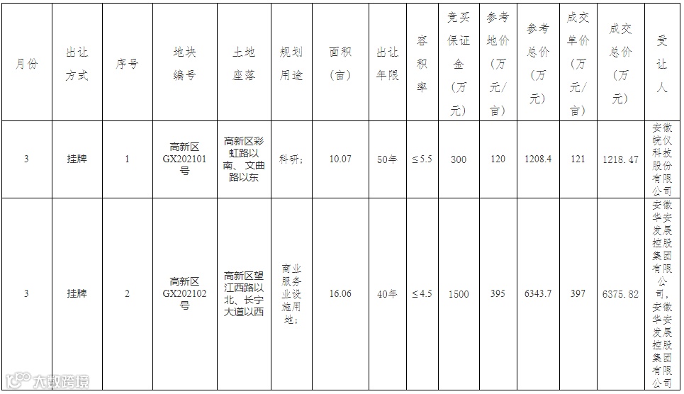 合肥高新区有2宗土地使用权成功出让,规划用途分别为科研用地和商业服务业设施用地。