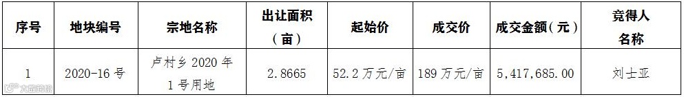 广德市卢村乡2020年1号用地面积约3亩,为零售商业用地,竞得者为个人。