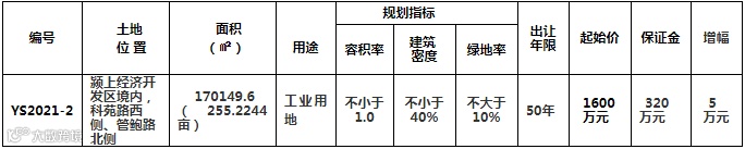阜阳市颍上县将挂牌出让经济开发区境内,科苑路西侧、管鲍路北侧YS2021-2号地块使用权,规划用途为工业用地,申请人可于4月20日到5月17日提交书面申请。