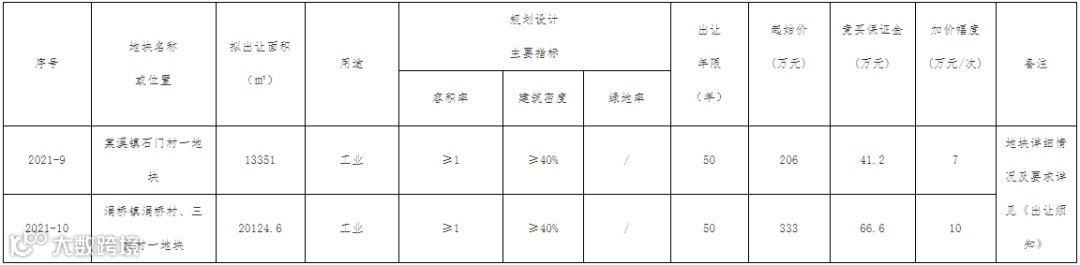 另外2宗分别位于棠溪镇石门村和涓桥镇涓桥村、三友村,申请人可于5月1日到5月10日提交参加公开出让活动书面申请,并足额交纳竞买保证金。
