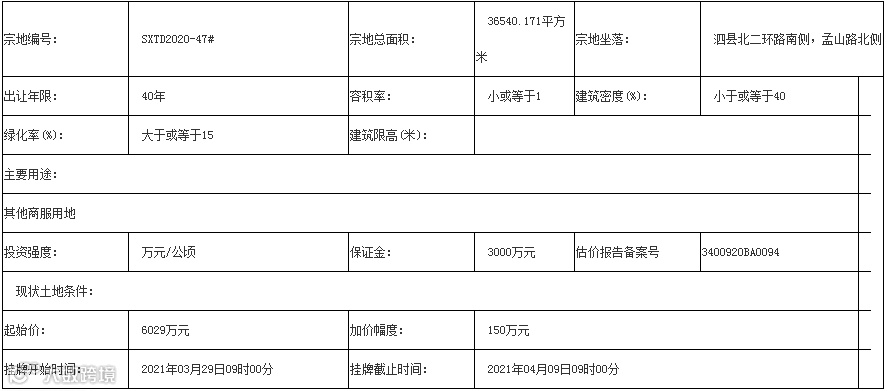 位于北二环路南侧,孟山路北侧的SXTD2020-47#地块和泗城镇虹乡社区的SXTD2020-41#地块为其他商务或商服用地,使用权出让年限为40年。