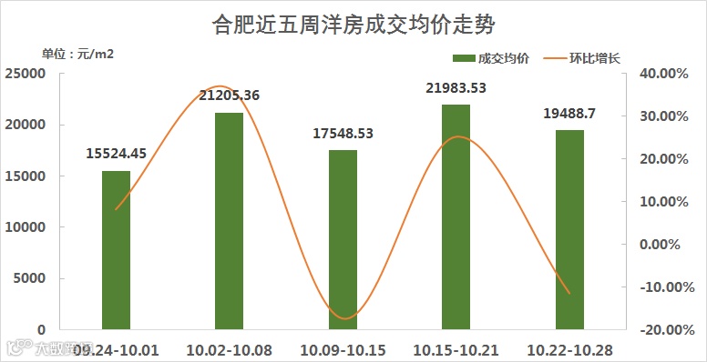 合肥洋房市场成交价格最近五周波动较大。上周成交均价为19488.7元/㎡,较前一周环比下跌11.35%;