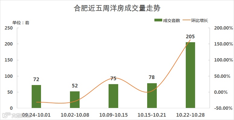 合肥洋房市场周成交量近五周一直稳步上升。上周合肥洋房成交量为205套,较前一周环比暴涨162.82%。