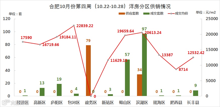 2018年10月22-28号期间,合肥洋房市场共供应113套,成交205套,成交量环比上涨162.82%;成交均价方面,包河区成为合肥上周洋房市场的高地,均价22839.22元/㎡;政务区上周没有洋房成交。