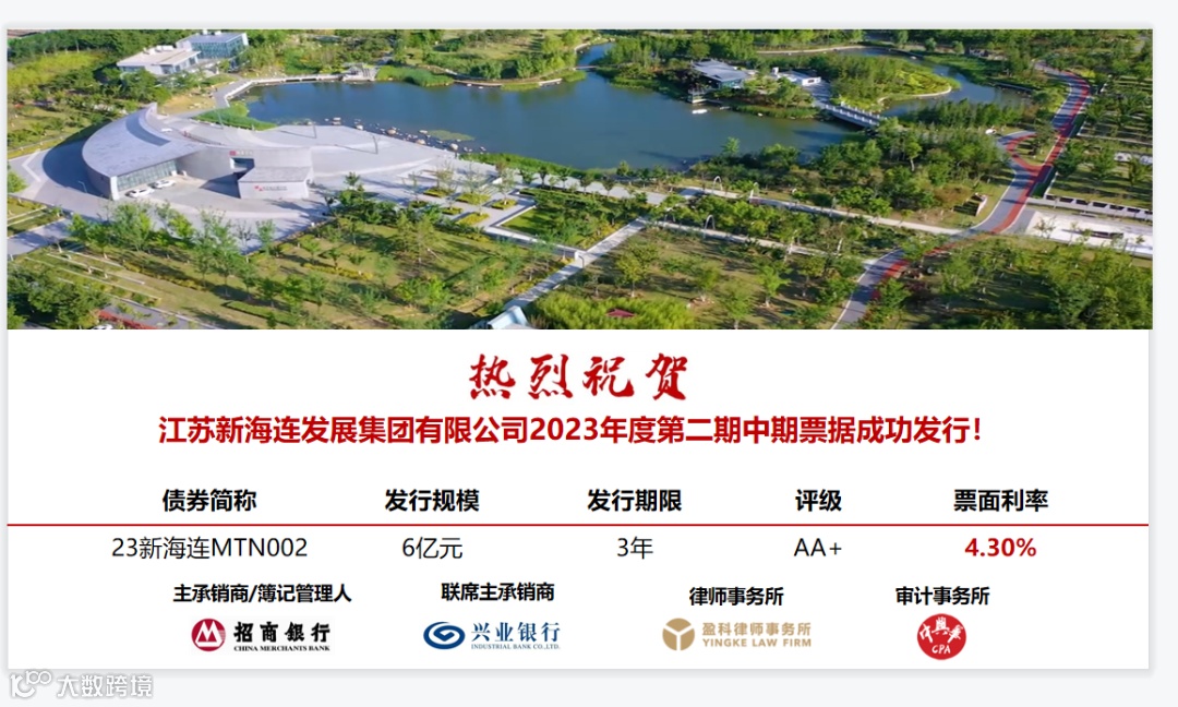 7月13日,新海连集团成功发行2023年第二期中期票据,金额6亿元,期限3年,票面利率4.3%,由招商银行、兴业银行联席主承销。
