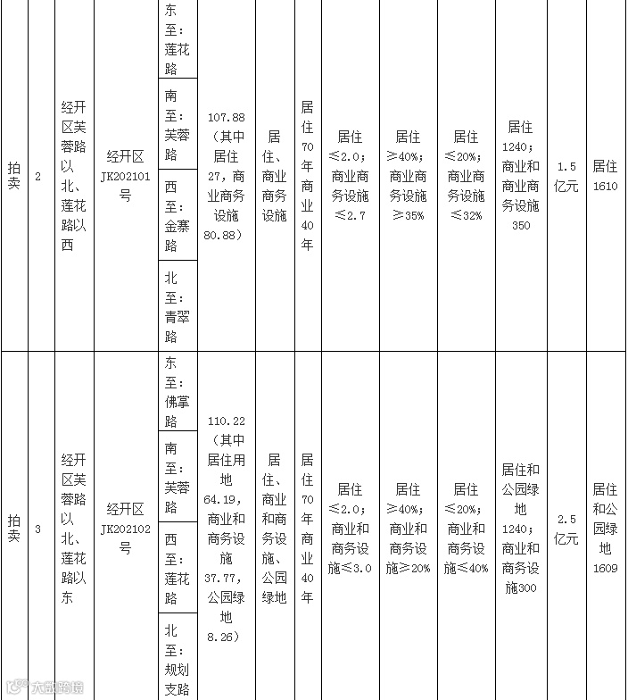 经开区芙蓉路以北、莲花路以西JK202101地块规划用途还包括商业商务设施用地,芙蓉路以北、莲花路以东JK202102地块包括居住、商业商务设施和公园设施3类,商业部分使用权出让年限为40年。
