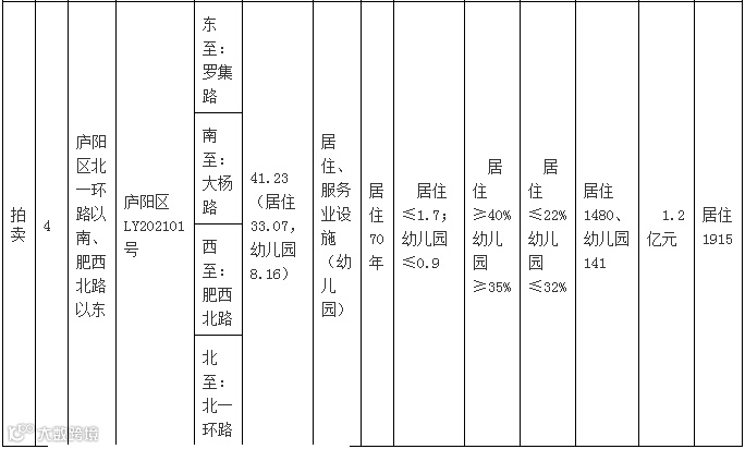 与瑶海区的地块相同,庐阳区北一环路以南、肥西北路以东LY202101号地块规划用途也包括居住用地和服务业设施(幼儿园)两类,使用权出让70年。
