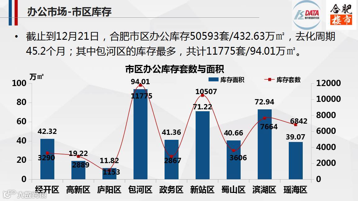 截止到12月底,合肥九区办公存量达50593套/432.63万㎡,去化周期为45.2个月,虽然比商业的去化周期短,但是去化压力仍然较大。