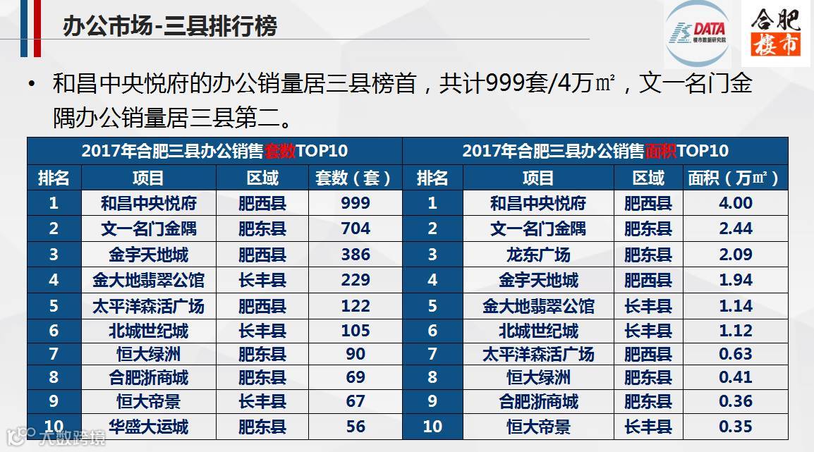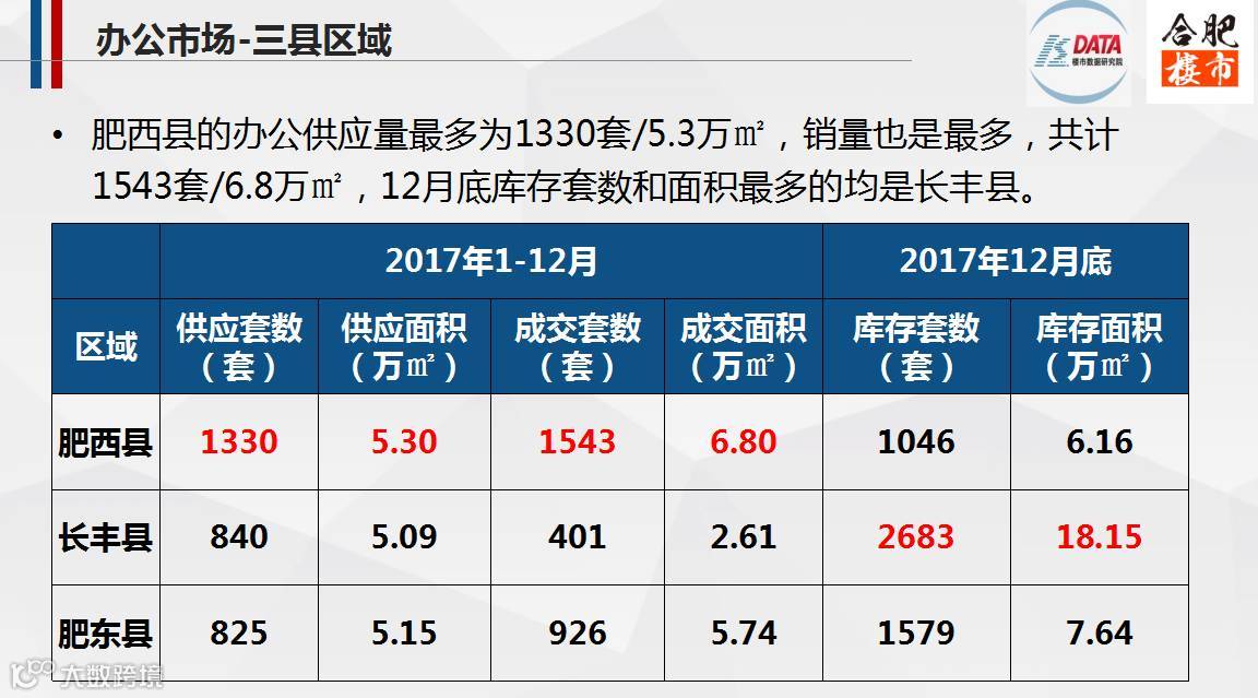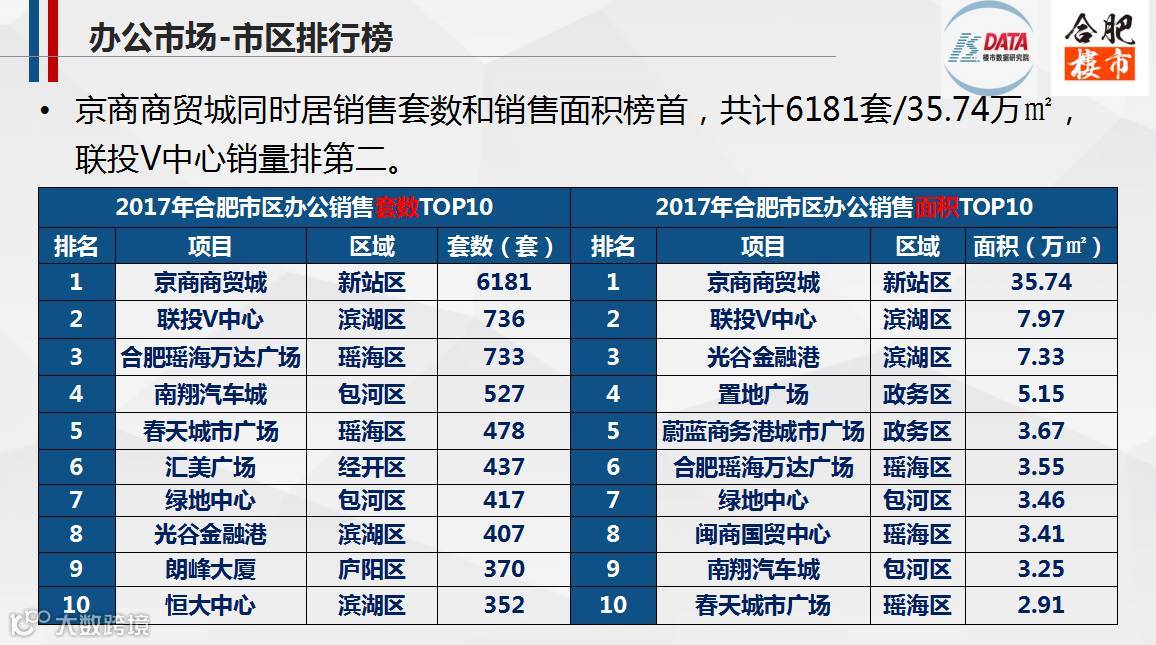 2017,合肥市区办公市场整体供需基本均衡,三县办公市场也如此;其中,新站区的京商商贸城办公销量居九区三县榜首,共计6181套/35.74万㎡,在市区的销量中占比24%。