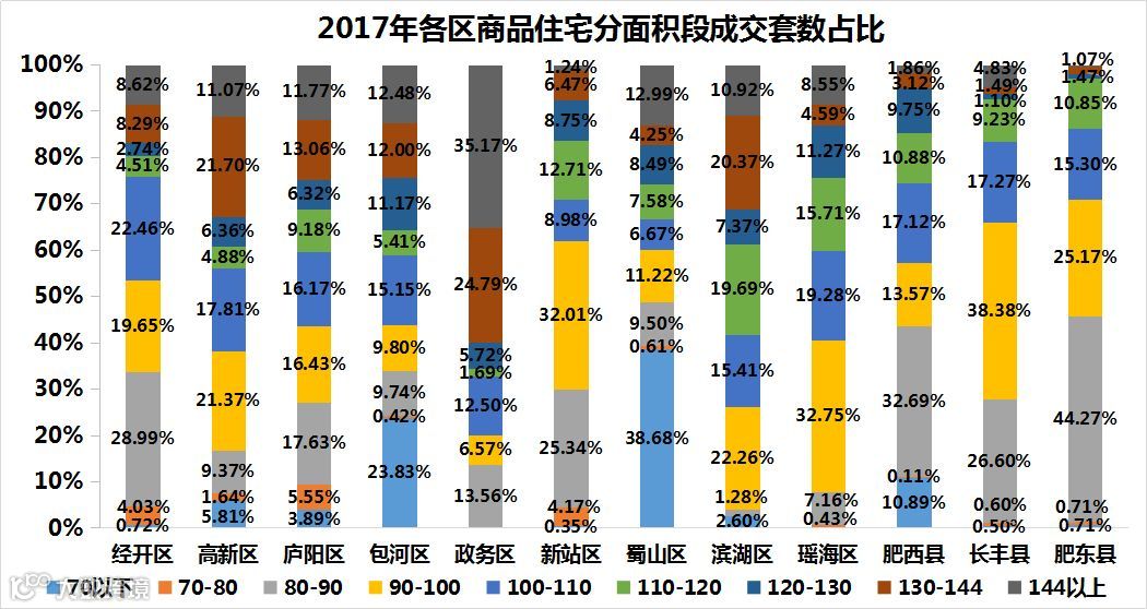 2017年合肥网签的楼盘中,包河区和蜀山区以70㎡以下的户型为成交的主力,主要是其成交的住宅公寓较多,所以小户型占比较多。