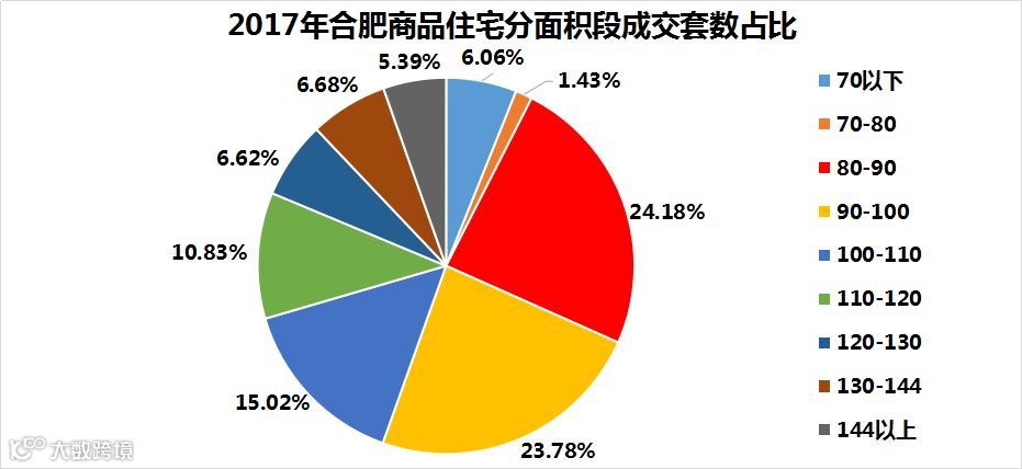 2017年,在合肥所有的网签楼盘中,80-90㎡的户型销量较多,成交占比为24.18%;其次是90-100㎡,占比23.78%;100-110㎡的成交占比15.02%,其他面积段的成交占比都较小。