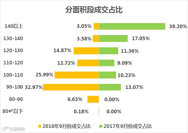 从面积段成交来看,90-100㎡之间的刚需户型成为成交主力,成交占比32.97%。其次是100-110㎡的房源,占比25.99%。