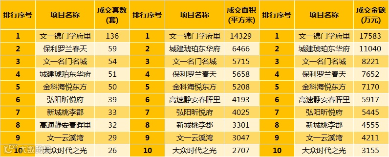 2018年9月,文一锦门学府里以136套/14329㎡/17583万元的销售成绩居销售套数、销售面积和销售金额榜首。保利罗兰春天以59套获得销售套数第二名;城建琥珀东华府以6466㎡/11040万元居销售面积和销售金额第二;文一名门名城以54套/5715㎡/8221万元位居三榜第三名。