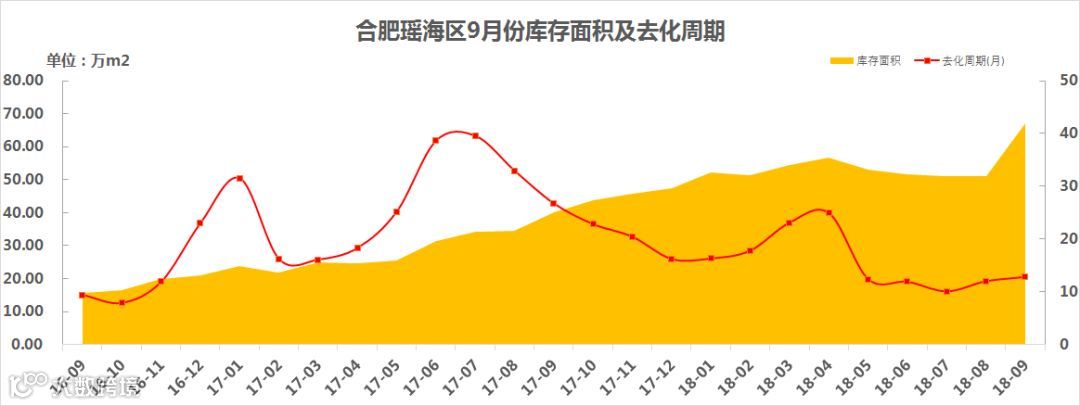 截止2018年9月30日,瑶海区的商品住宅可售量为6174套/67.20万㎡ 。去化周期为12.8个月,较8月份增长0.8个月(该数据以备案为准,不排除实际售出、在等备案的房源数据)。