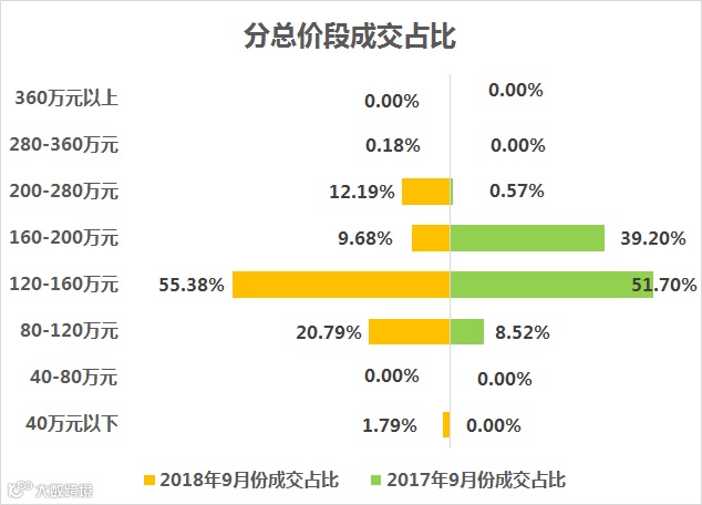 从价格段来看,总价120-160万元之间的产品成为成交主力,占比55.38%。其次是80-120万元之间的产品,占比20.79%。