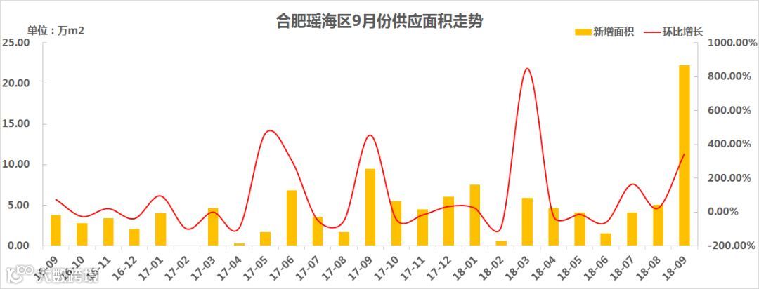 虽然自2018年6月份开始,瑶海区新房供应量一直处于上涨趋势,但6-8月份的月均供应数量依然较少,均没超过10万㎡。2018年9月,瑶海区共新增1909套/22.21万㎡,环比暴涨342.70%,也达到自2016年10月份以来供应面积新的峰值。