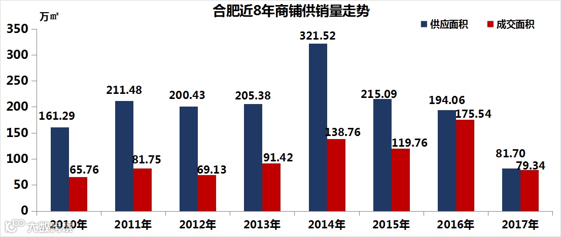 从图表可以看出,2010-2017年,合肥商铺的供销量一直处于波动之中,2014年的供应量是最多的,共计新增商铺35531套/321.52万㎡,而2016年的成交量最多,共计27669套/175.54万㎡。