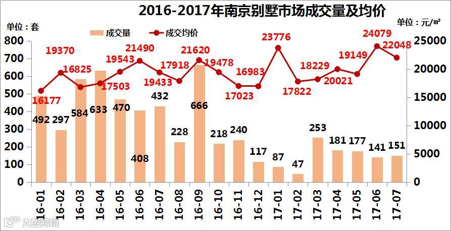 限购后期,南京别墅市场成交量有所下降,7月份别墅共成交151套/4.17万㎡,面积环比微涨0.24%;别墅成交均价22048元/㎡,环比跌8.43%(江雁郦湖美墅成交43套/12826.05元/㎡、华山山庄成交16套/21000.52元/㎡和海伦国际成交10套/12634.45元/㎡)。