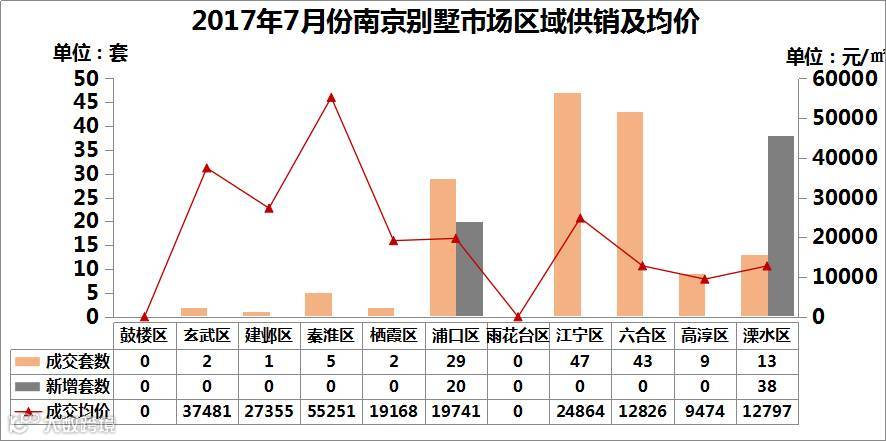 7月份,除溧水区与浦口区有别墅供应外,其他区域均无别墅供应;且溧水区的供应量是最多的,为0.89万㎡;江宁区的成交面积最多,为1.29万㎡;秦淮区成交均价55251元/㎡,居各区榜首;7月底库存面积最多的是江宁区26.18万㎡。