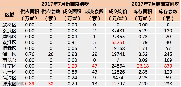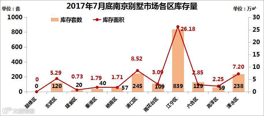 目前,江宁区的别墅库存量最高,为839套/26.18万㎡;鼓楼区的库存为0。