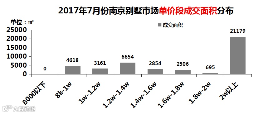 7月别墅在2万以上这个价位段成交最多,成交的面积为21179㎡,其次是1.2w-1.4w的单价段,成交6654㎡。