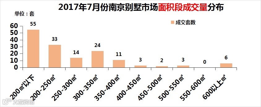 7月别墅成交主力户型为200㎡以下,成交55套,其次是200-250㎡,成交33套。