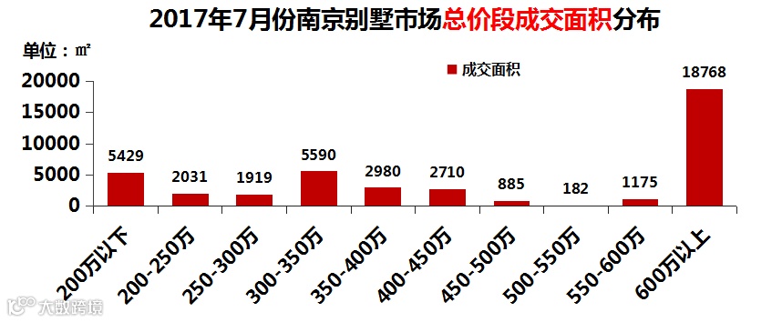 7月别墅在600万以上这个价位段成交最多,成交的面积为18768㎡。
