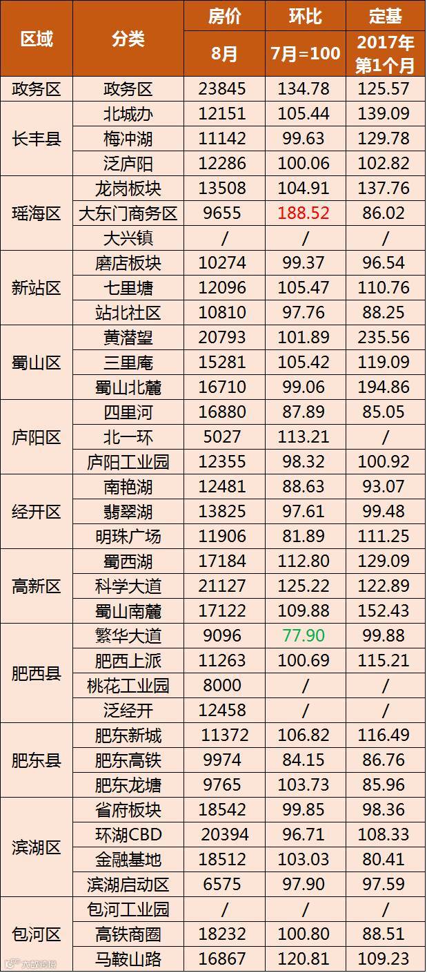 1、8月份,合肥36个板块中,18个板块房价环比上涨,14个板块环比下跌;相比于1月份,18个板块房价上涨,13个板块房价下跌。