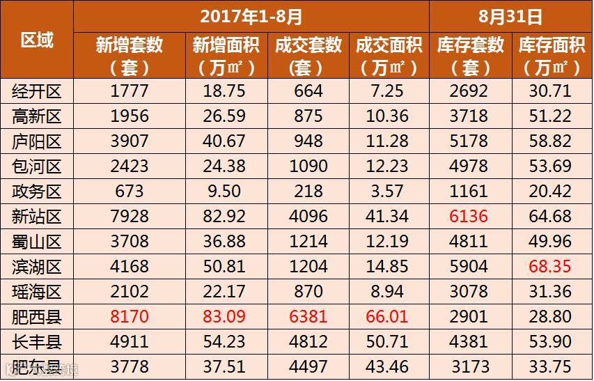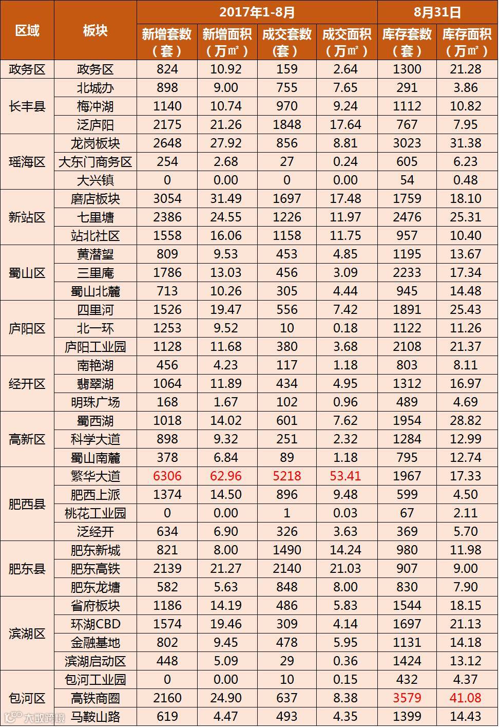 1、从供应量来看,2017年1-8月,肥西县的商品住宅新增量最多,共计8170套/83.09万㎡;新站区次之,共计7928套/82.92万㎡;其次是长丰县,新增商品住宅4911套/54.23万㎡。