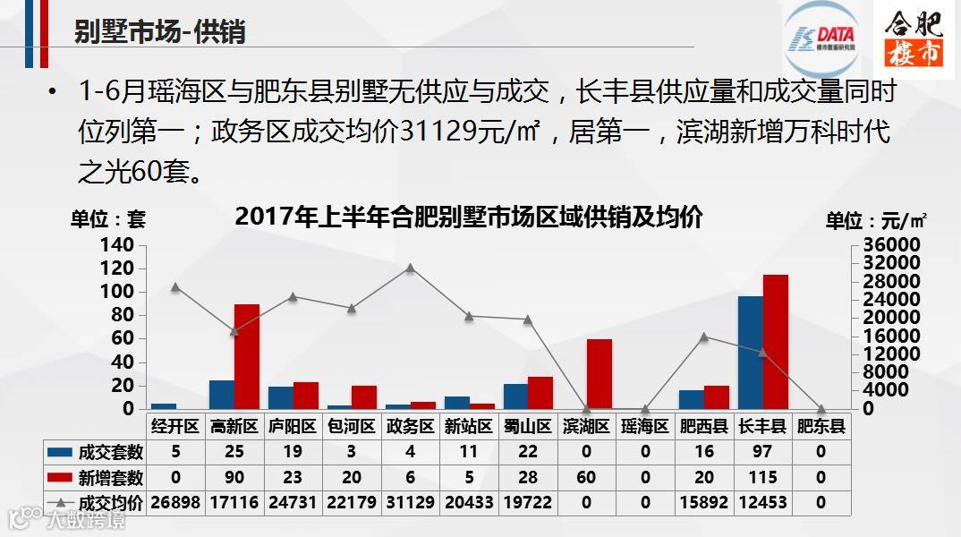 由于限购政策导致合肥市区别墅市场整体需求下降,别墅供给也相对减少;在2017年上半年,长丰县别墅项目成为楼市主销楼盘,首先是因为三县不限购,其次在于其均价12453元/㎡相比一些高端住宅、洋房的价位,并不高,最后是金科半岛1号开盘之后,其一系列营销动作推高了长丰县整体销量。