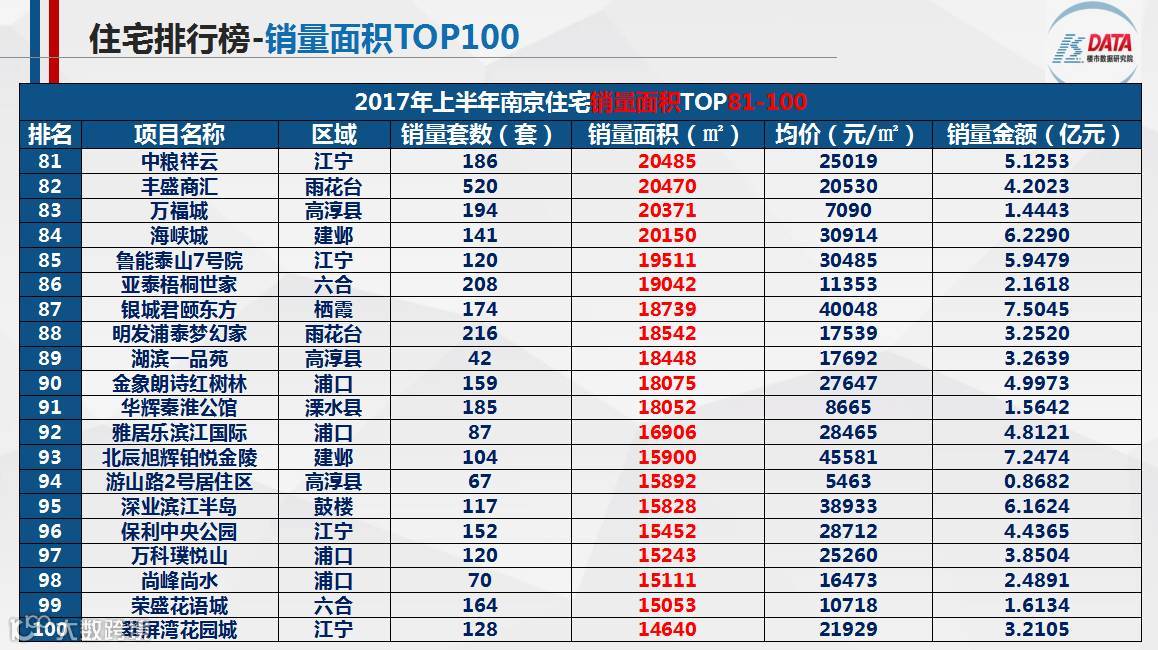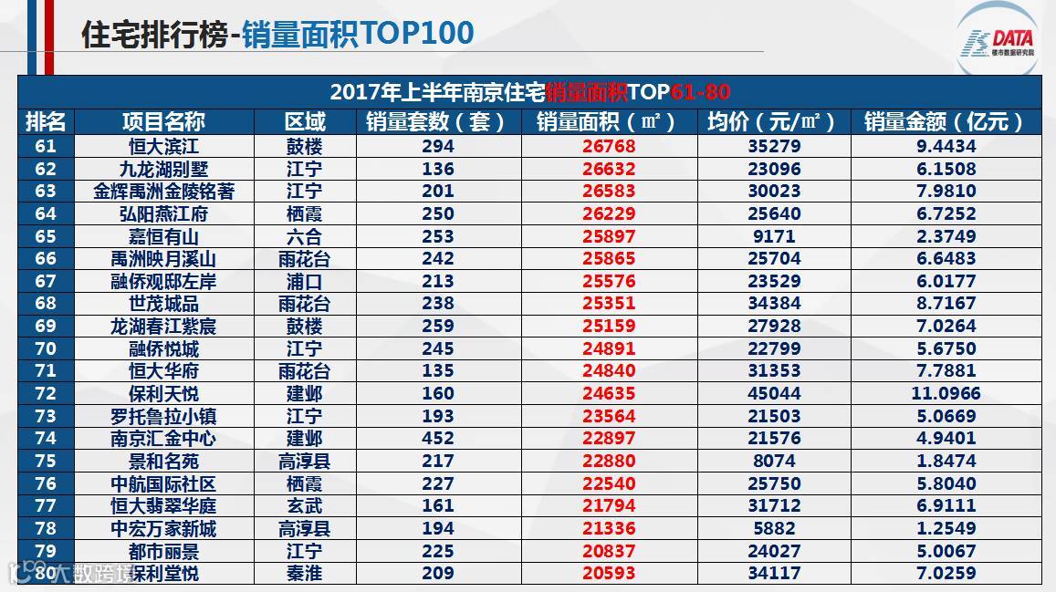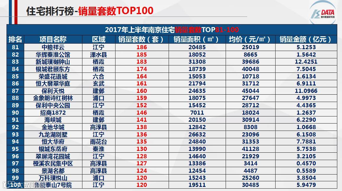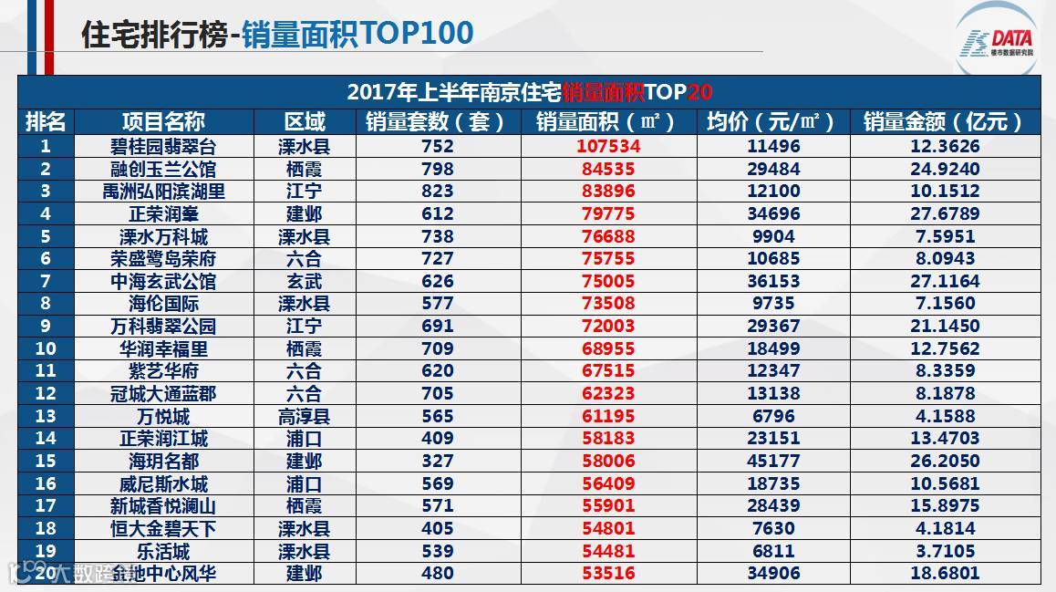 从总体来看,江宁区最热区域;无论是从销售套数还是面积或者销售金额来看,其进军TOP100销售排行榜的盘数都是最多的,分别是23盘、23盘和26盘。