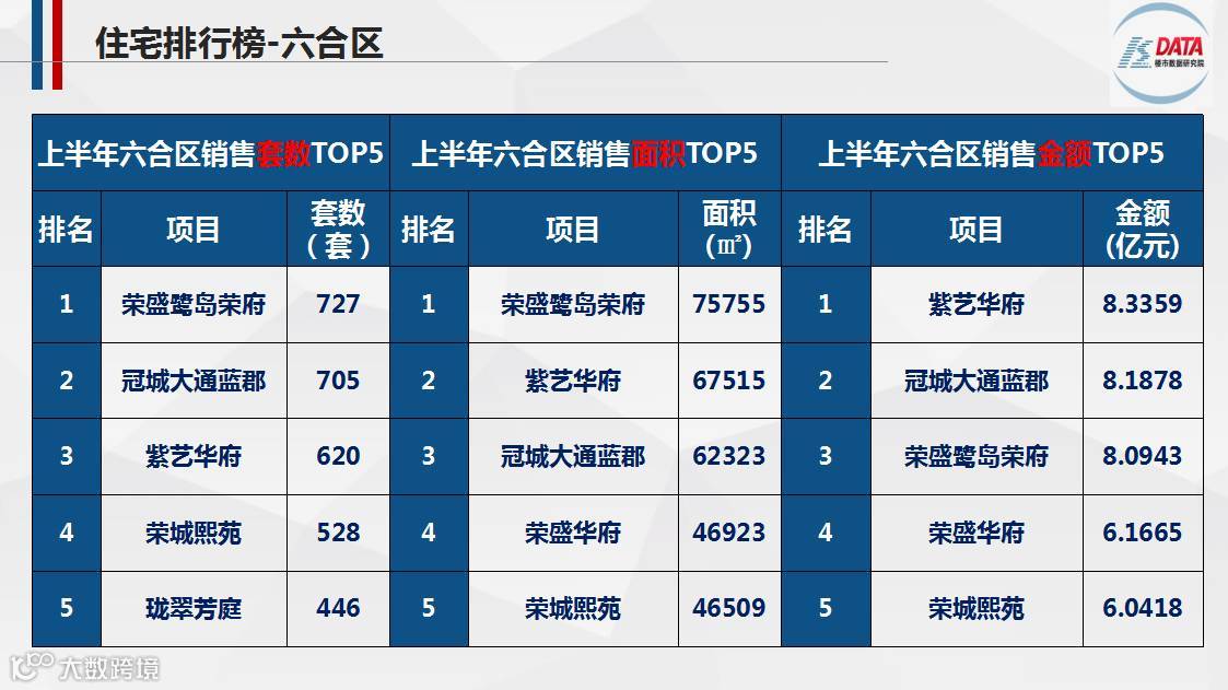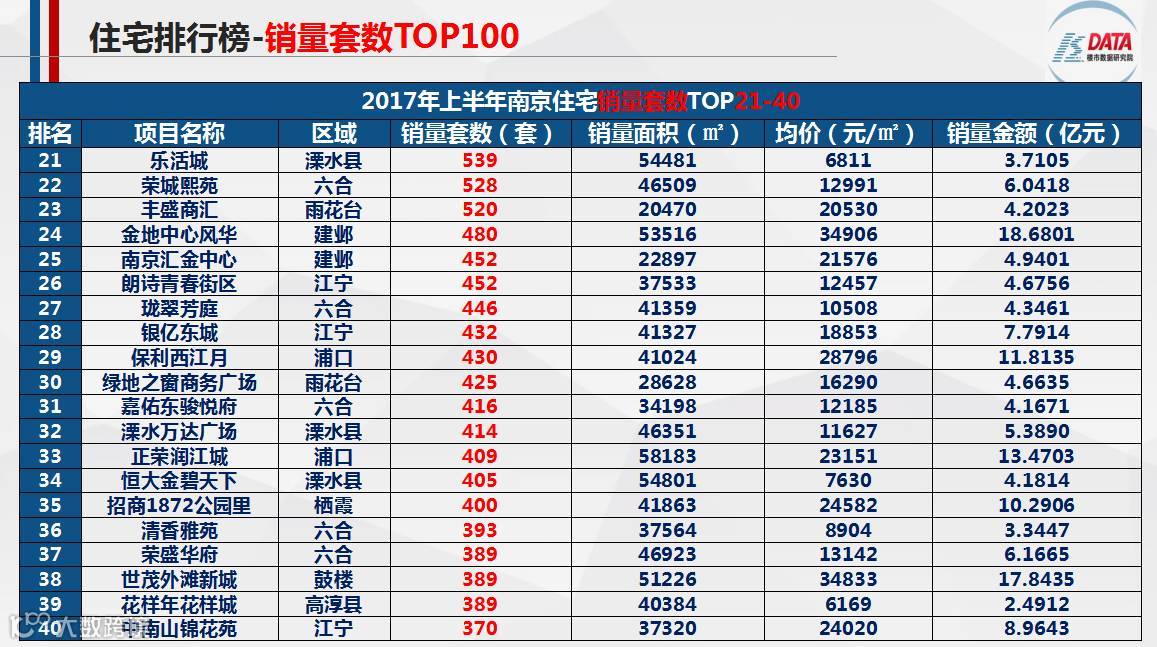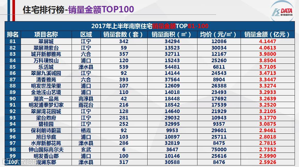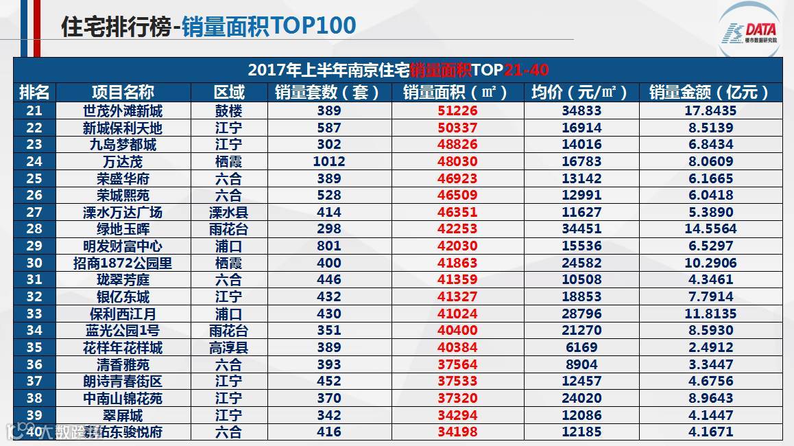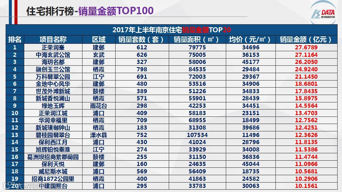从总体来看,江宁区最热区域;无论是从销售套数还是面积或者销售金额来看,其进军TOP100销售排行榜的盘数都是最多的,分别是23盘、23盘和26盘。
