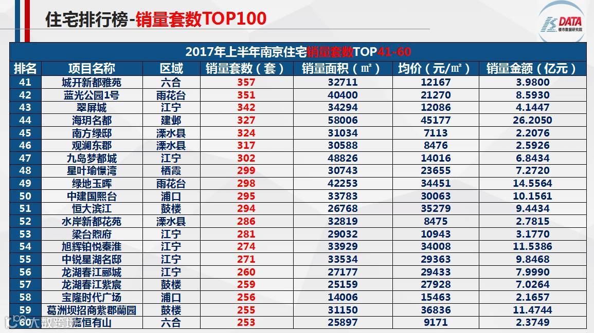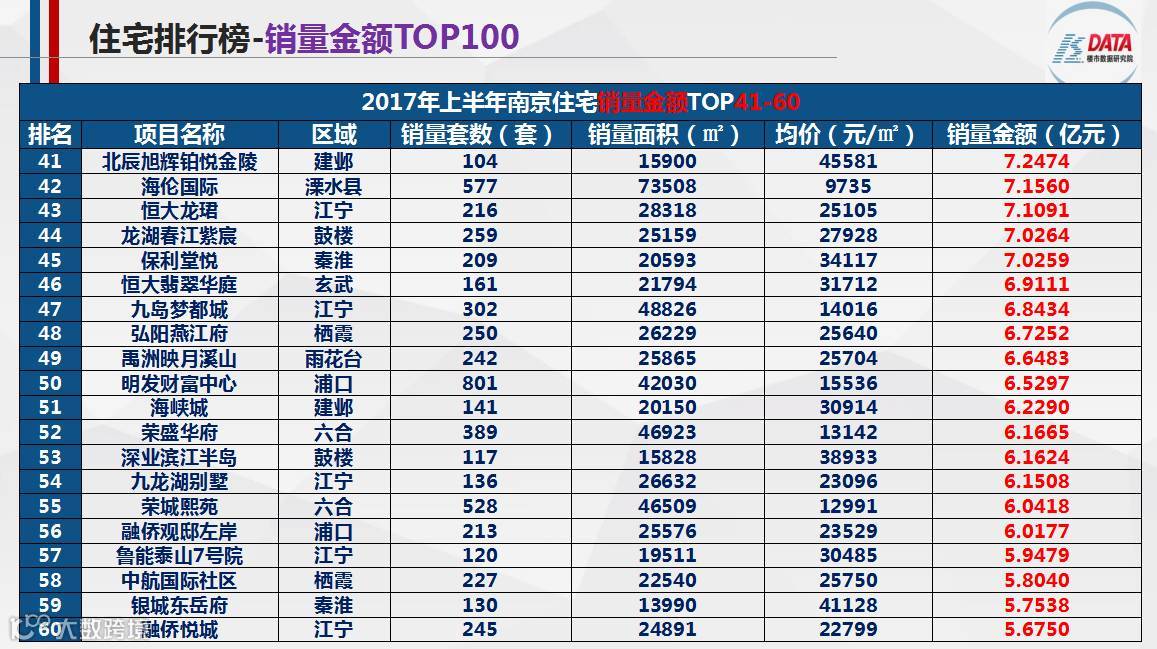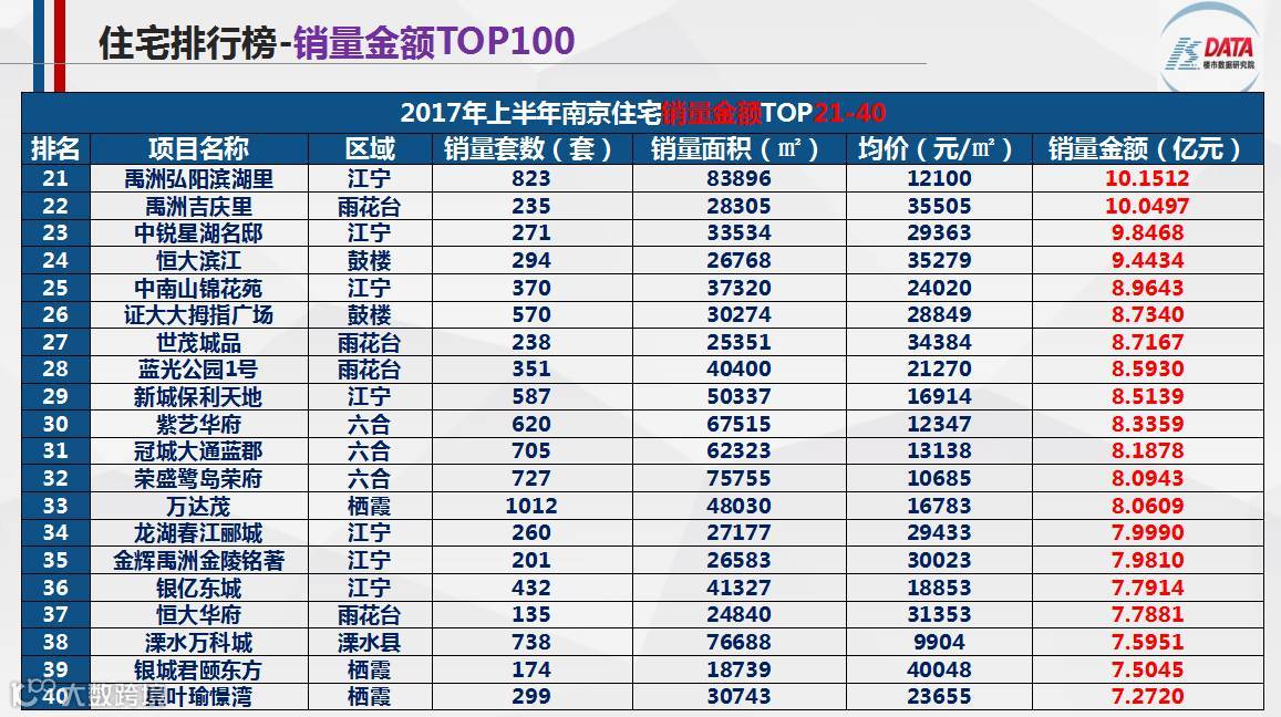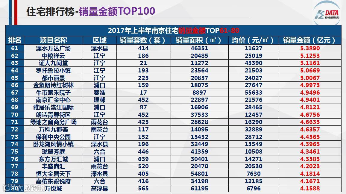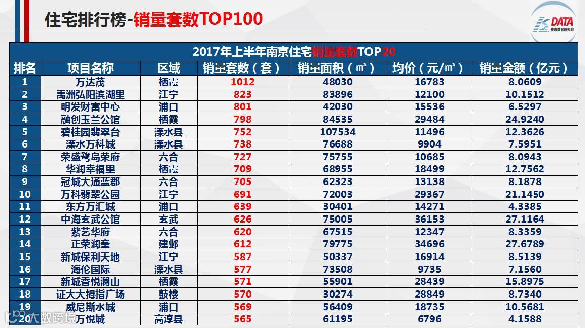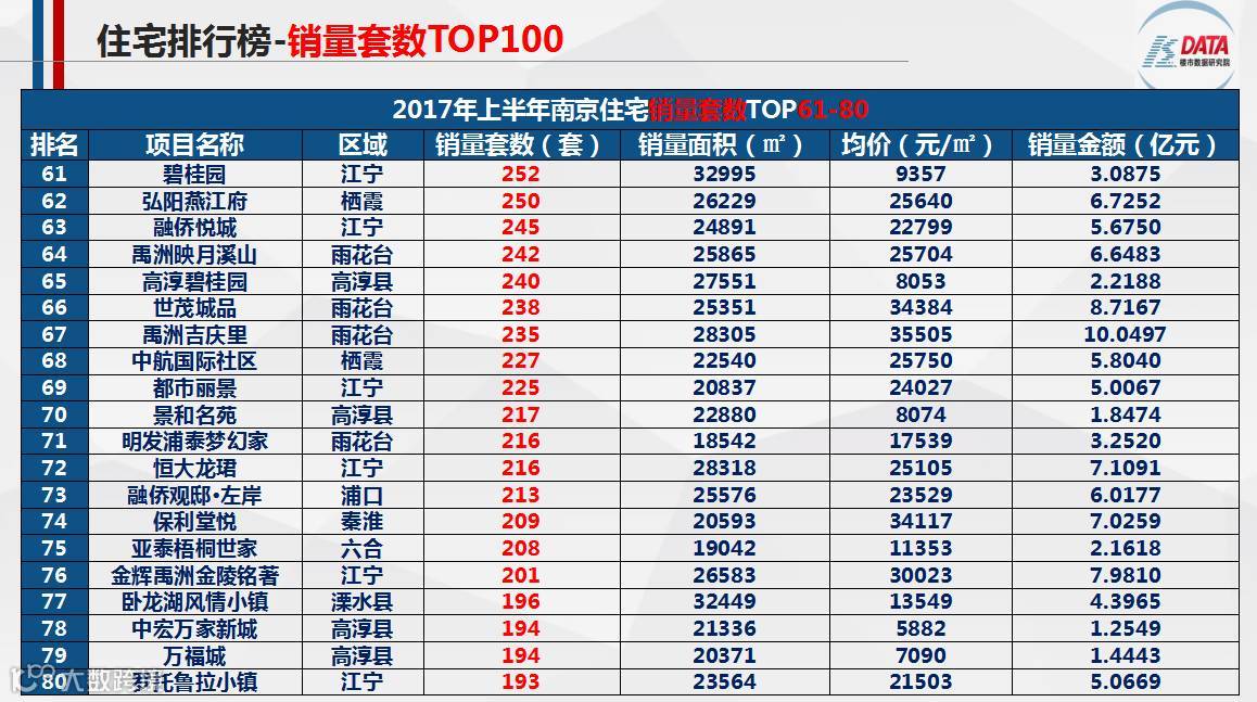 从销售套数来看,栖霞区居第一,1012套;随后是江宁区的禹洲弘阳滨湖里823套和浦口区的明发财富中心801套;栖霞区3盘进军TOP10。