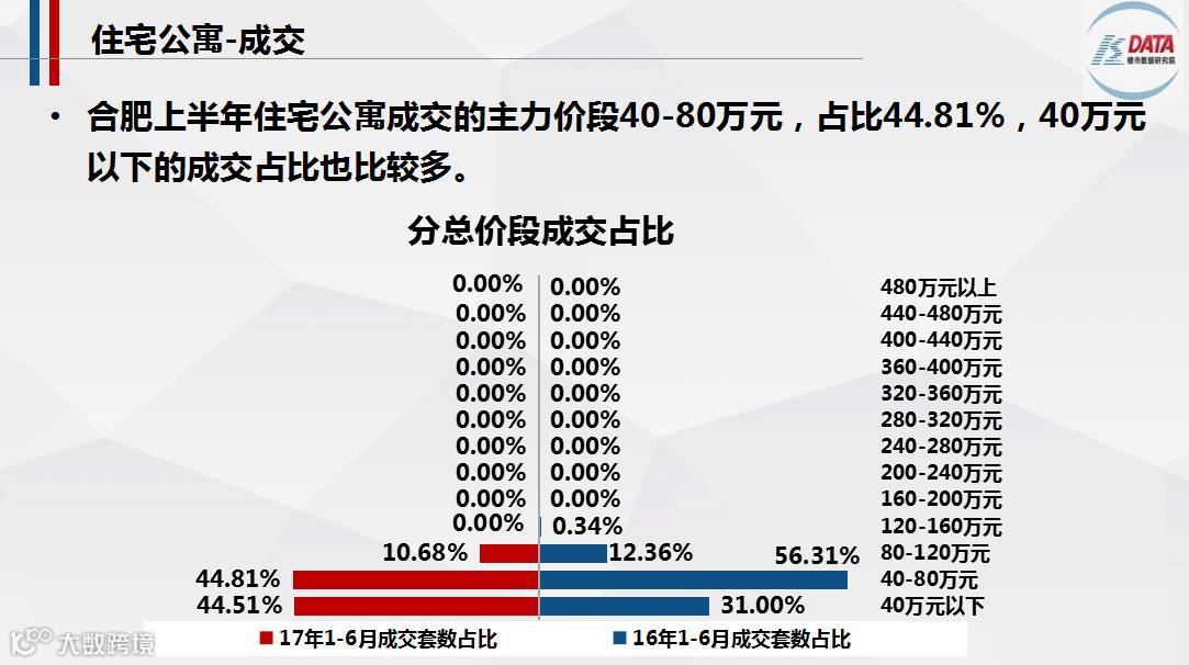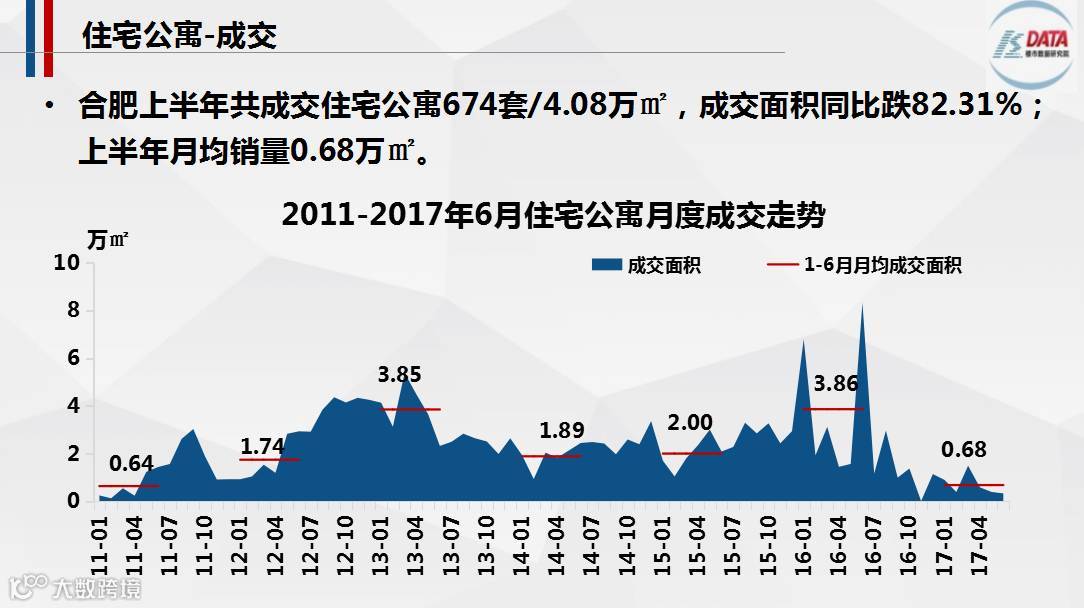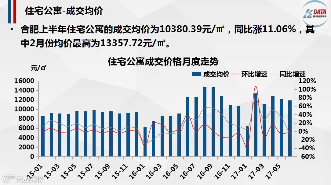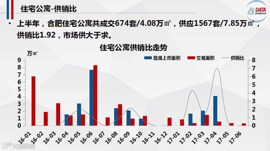 合肥上半年住宅公寓成交量跌价涨,上半年共成交674套/4.08万㎡,同比2016年上半年跌82.31%,主要是受去年10月份限购政策的影响;房价涨至10380.39元/㎡,同比上涨11.06%。
