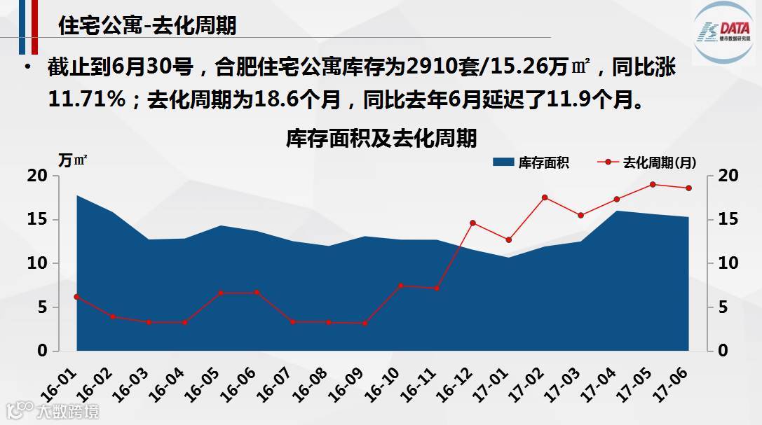 上半年住宅公寓供应1567套/7.85万㎡,供销比为1.92,住宅公寓市场供大于求;合肥住宅公寓库存2910套/15.26万㎡,同比涨11.71%。库存增加,去化周期也随之延长,比2016年上半年延长了11.9个月。