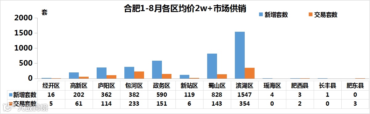 今年1-8月份,新增套数前三的区域分别是滨湖区、蜀山区和政务区;而成交均价在2万元/㎡以上的前三区域分别是滨湖区、包河区和政务区,而瑶海区和长丰县1-8月没有网签备案量。