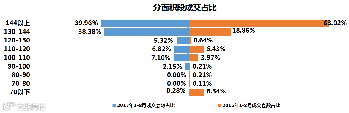 今年1-8月份,从分面积段来看,合肥均价2万元/㎡以上的商品住宅市场以130㎡以上的户型为成交的主力,成交占比78.34%,比去年1-8月成交占比减少了3.54%。