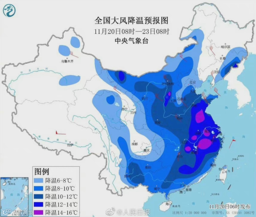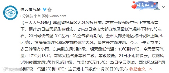 从今天发布的全国大风降温预报图来看,连云港基本处于降温幅度最大的地区。