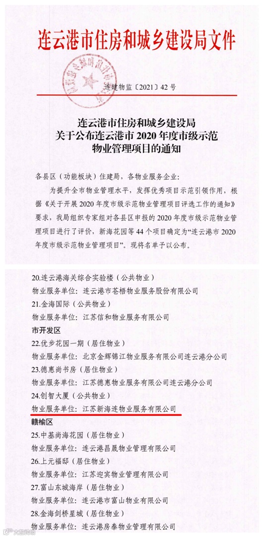 伊始,喜报频传。2月19日,从市住房和城乡建设局传来喜讯,新海连物业公司在全市500余家物业公司中崭露头角,公司承接的创智大厦项目