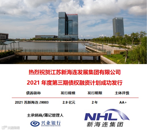 1月28日,新海连集团成功发行2021年第三期债权融资计划,金额2.9亿元,期限2年,挂牌年利率5.2%,由兴业银行主承销。
