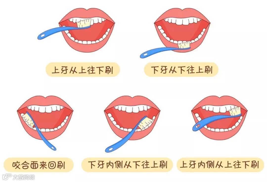 将牙刷斜立呈45度角,用垂直或打圈的方式轻轻地一层一层刷,不要直接横着刷,以2~3颗牙为一组,用短距离水平颤动在同一个部位刷数次。刷牙后,最好用牙线清除牙邻面菌斑。