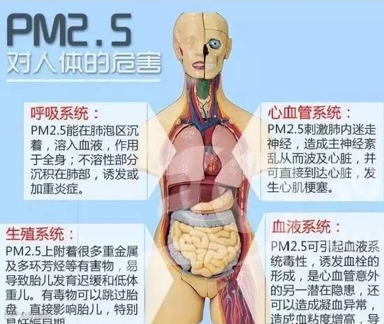 PM2.5的体积非常小可以直接进入血液循环,进而影响全身,导致多种伤害。