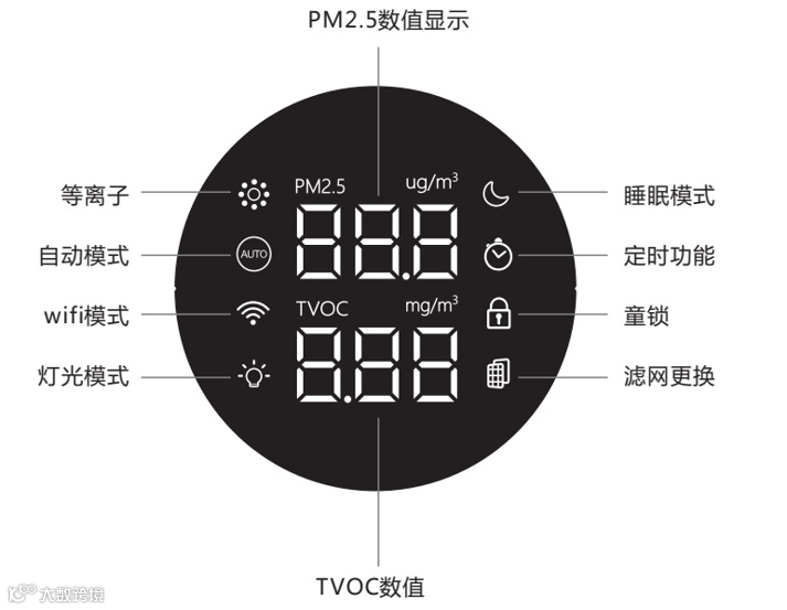 PM2.5、TVOC数值显示,对各功能工作情况显示一目了然,且有三种颜色蓝、橙、红综合显示空气质量。做到空气质量可视化,实时监控空气质量。