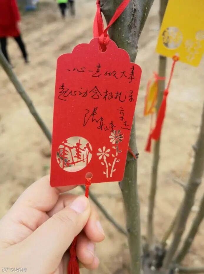 活动现场每两人一组,挖坑、浇水、放置树木,各组分工明确,每组伙伴都种下了一颗代表梦想的同心树木。并将许愿卡悬挂在了树上。