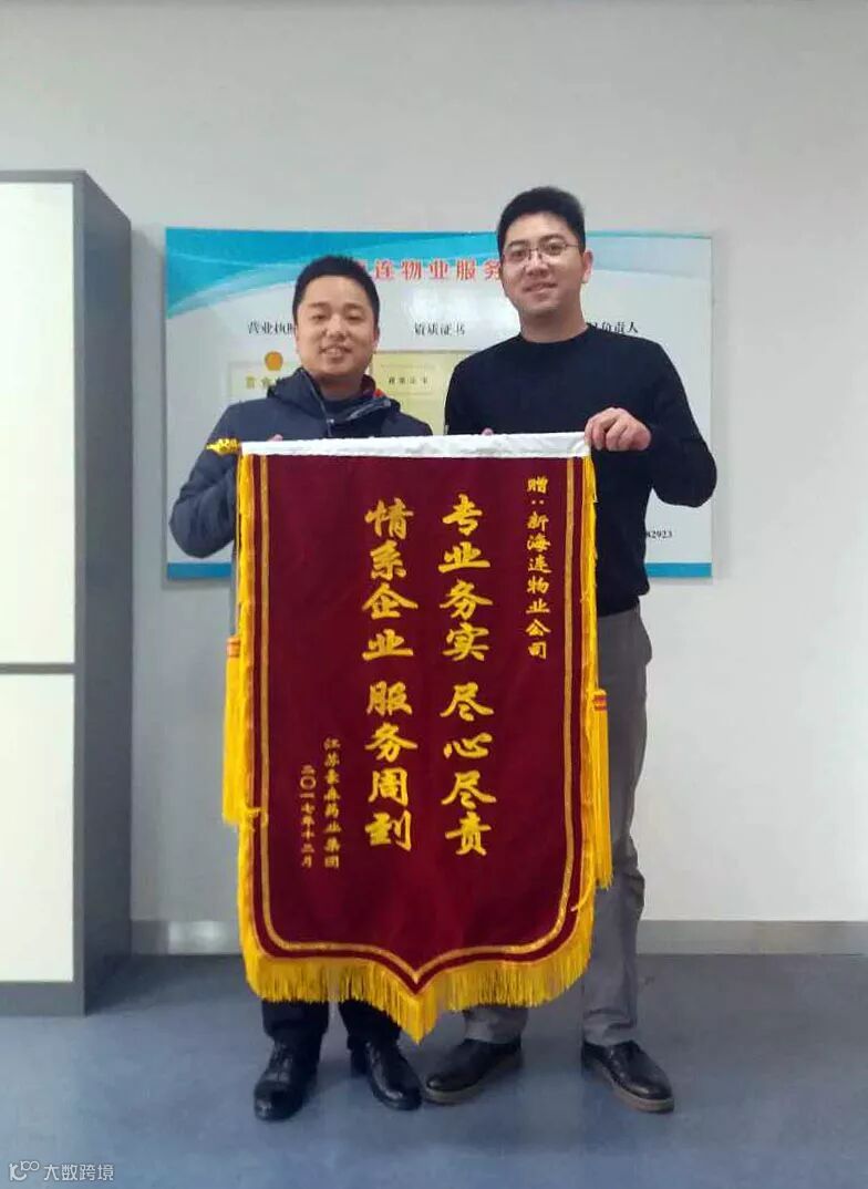 近日,豪森集团下属康美物业公司副总经理詹龙坤先生冒着严寒,给新海连物业公司送来锦旗,感谢新海连物业服务人员在工业邻里中心项目点上给予的无微不至的悉心服务。集团总经理助理武虹百接待了詹龙坤先生。