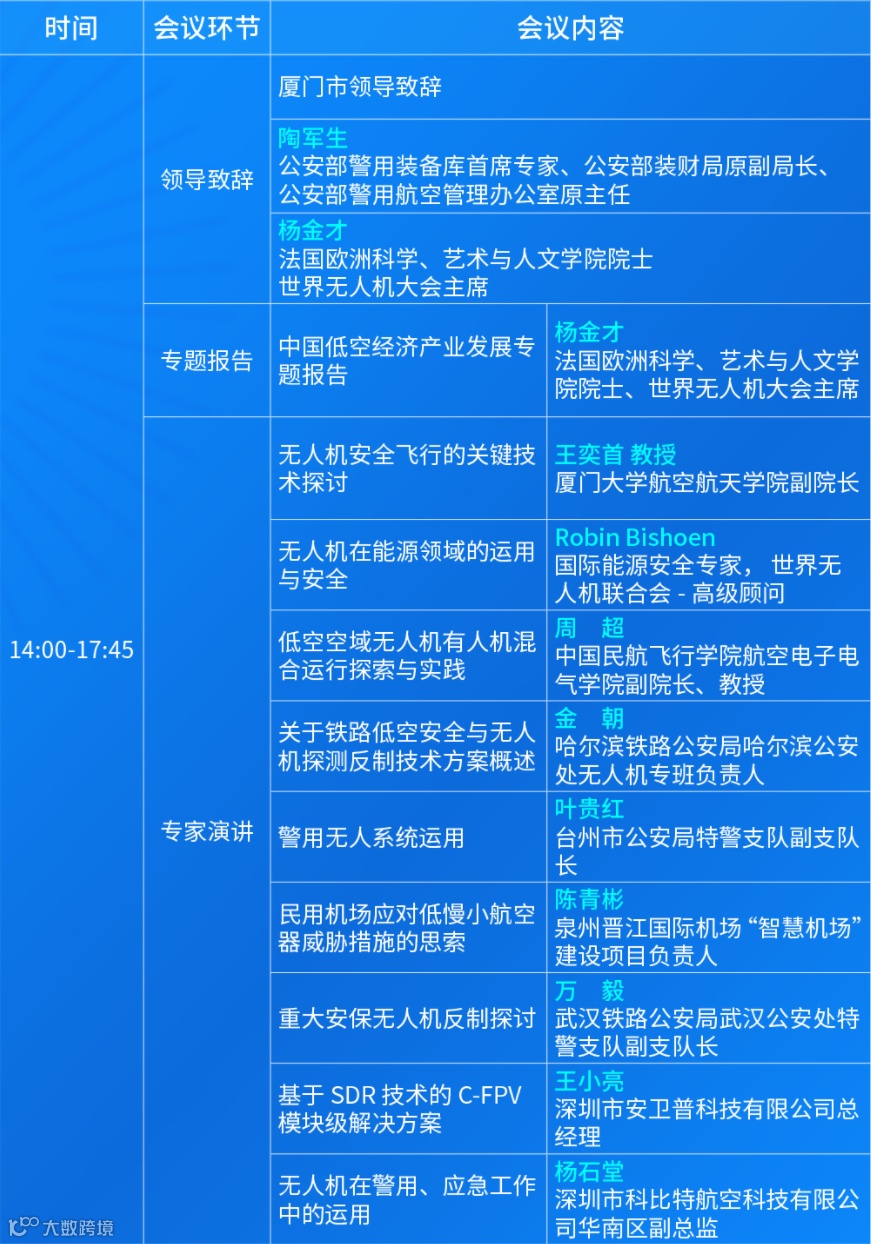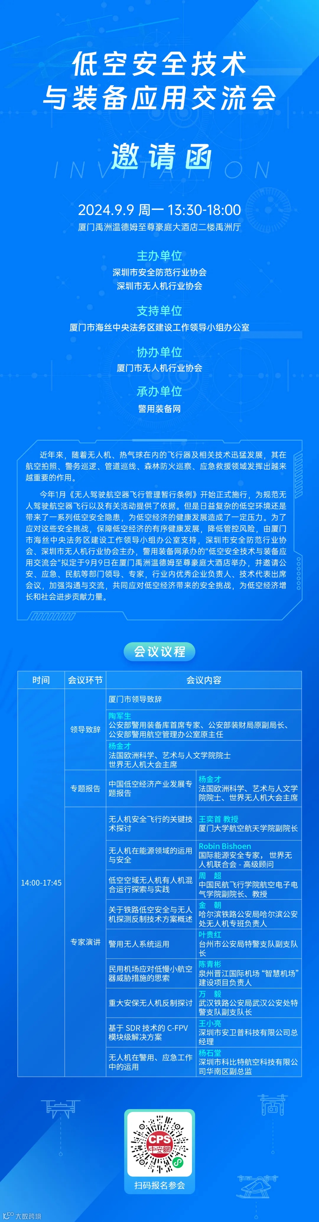 今年1月《无人驾驶航空器飞行管理暂行条例》开始正式施行,为规范无人驾驶航空器飞行以及有关活动提供了依据。但是日益复杂的低空环境还是带来了一系列低空安全隐患,为低空经济的健康发展造成了一定压力。为了应对这些安全挑战,保障低空经济的有序健康发展,降低管控风险,由厦门市海丝中央法务区建设工作领导小组办公室支持,深圳市安全防范行业协会、深圳市无人机行业协会主办,厦门市无人机行业协会协办,警用装备网承办的"低空安全技术与装备应用交流会"拟定于9月9日在厦门禹洲温德姆至尊豪庭大酒店举办,并邀请公安、应急、民航等部门领导、专家,行业内优秀企业负责人、技术代表出席会议,加强沟通与交流,共同应对低空经济带来的安全挑战,为低空经济增长和社会进步贡献力量。