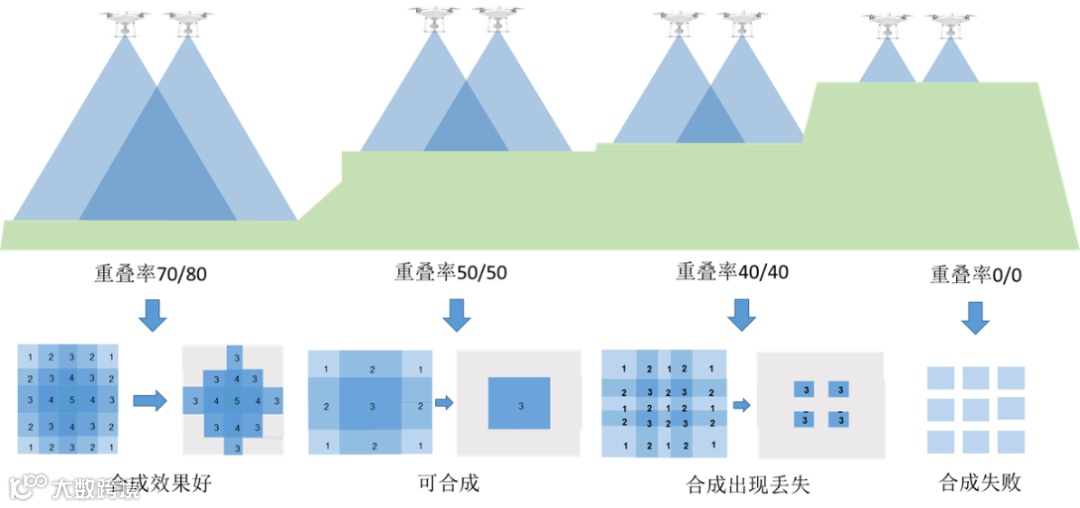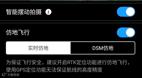 开启实时仿地飞行功能不仅能在作业中保证重叠率及精度,也能进一步提升作业效率。以往为了保证在地形起伏情况下的重建效果,无人机默认的重叠率(旁向70%/航向80%)较高。采用仿地飞行功能可适当降低重叠率(旁向60%/航向70%), 以提高作业效率。
