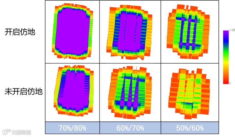 测区高差100米,开启实时仿地和未开启仿地重叠度效果对比