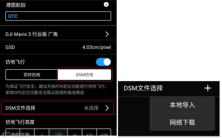 飞行高度超过200米时,建议使用DSM仿地功能,通过点击网络下载按钮下载高程数据。