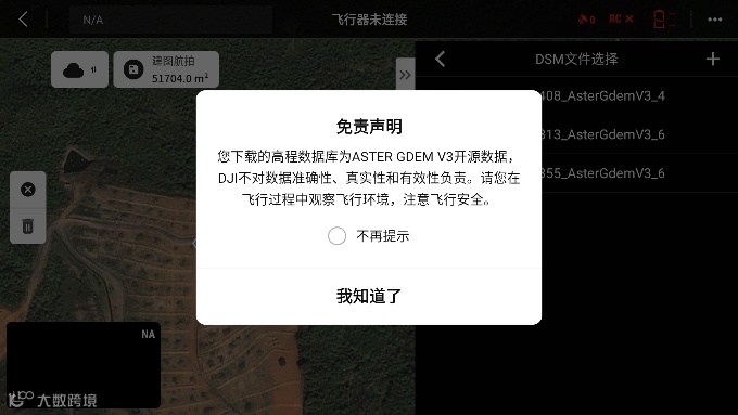 ASTER GDEM V3开源数据不包含地物信息,实时性较差,无法准确反应此时的地形状况。不建议低于80米时使用ASTER GDEM V3开源数据。ASTER GDEM V3开源数据的水平精度30米,垂直精度约为20米,其精度不如使用大疆智图制作的DSM文件。低于80米时建议通过本地导入功能,导入大疆智图现场制作的gsddsm.tif文件进行仿地飞行。